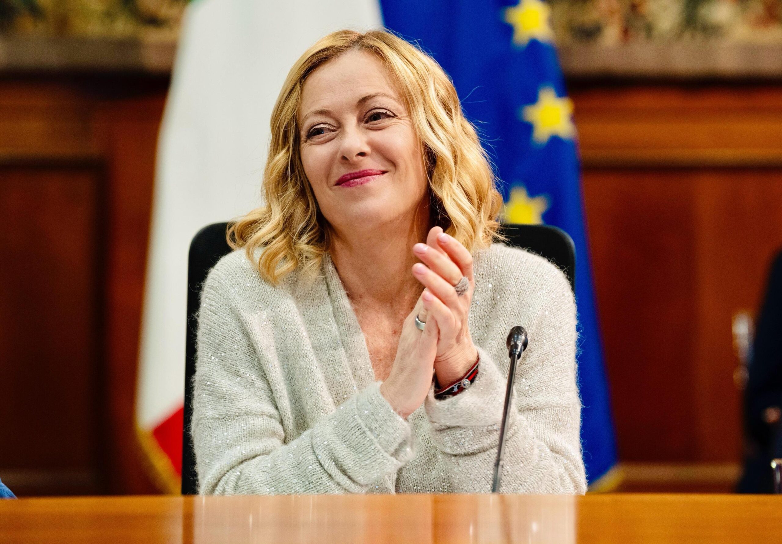 Giorgia Meloni tiene tra le mani un oggetto che non dovrebbe essere lì, in mezzo ai fasti della diplomazia internazionale.